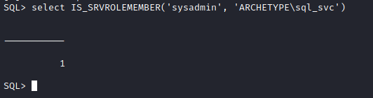 Podemos utilizar a função IS_SRVROLEMEMBER, para verificar se o usuário sql_svc tem privilégios administrativos.