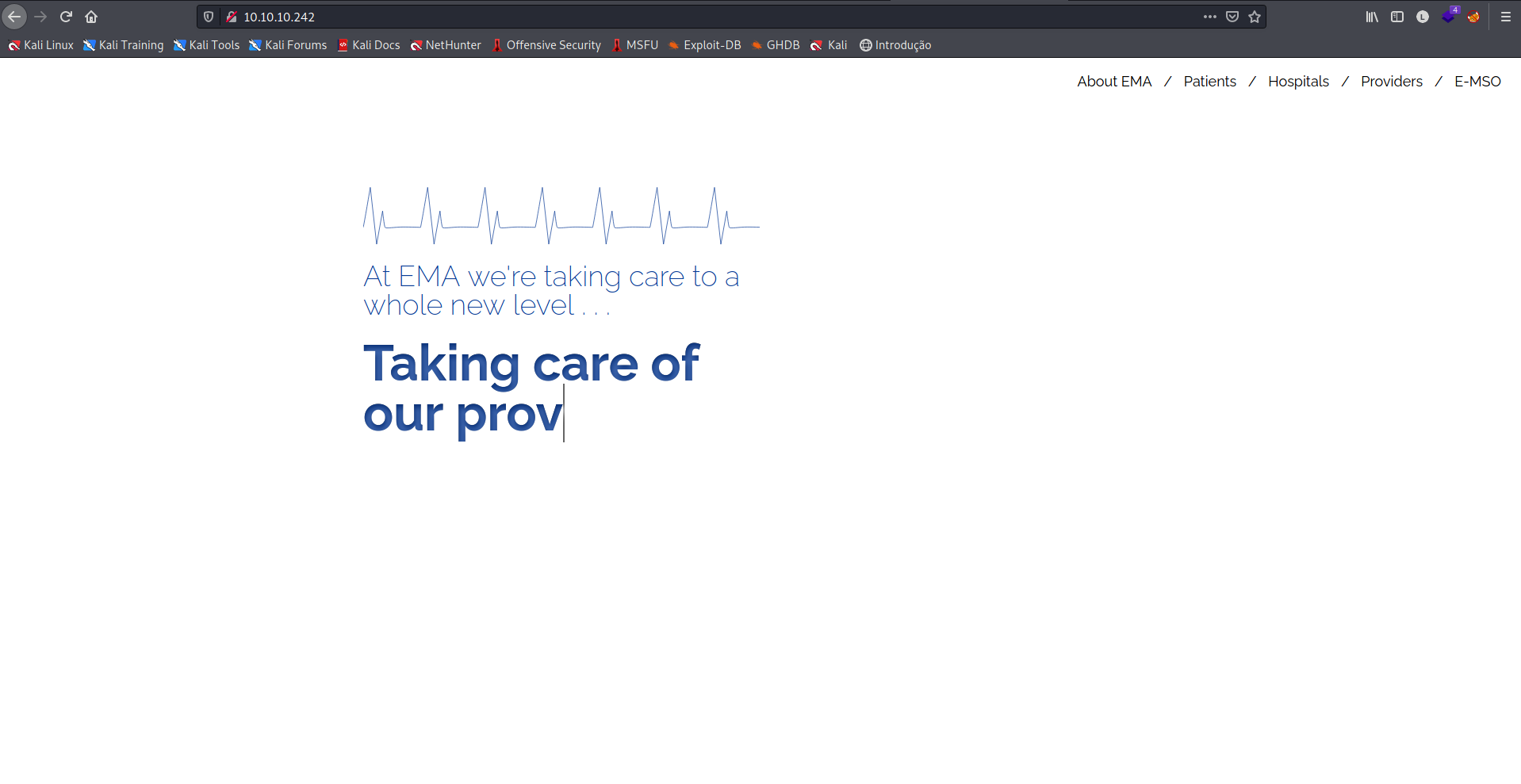 http://10.10.10.242/ [200 OK] Apache[2.4.41], Country[RESERVED][ZZ], HTML5, HTTPServer[Ubuntu Linux][Apache/2.4.41 (Ubuntu)], IP[10.10.10.242], PHP[8.1.0-dev], Script, Title[Emergent Medical Idea], X-Powered-By[PHP/8.1.0-dev]
