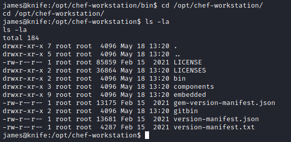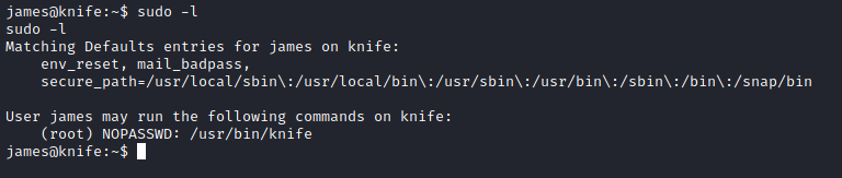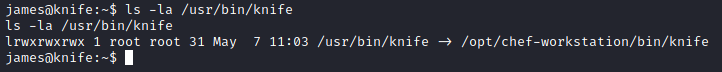 O usuário tem permissão de executar /usr/bin/knife com privilégios de administrador sem uso de senha, vamos enumerar este binário.
