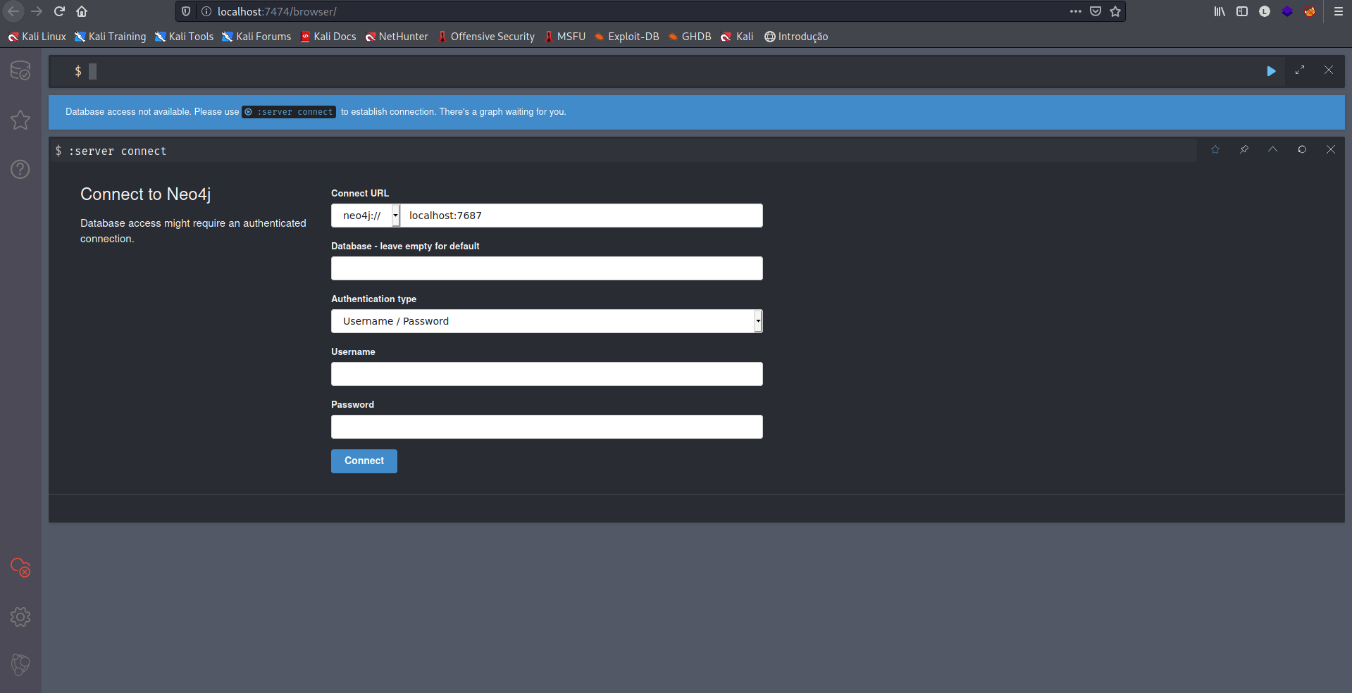As credenciais iniciais para utilizá-lo, são neo4j:neo4j. Logo no primeiro acesso, ele pedirá para trocar a senha de acesso.