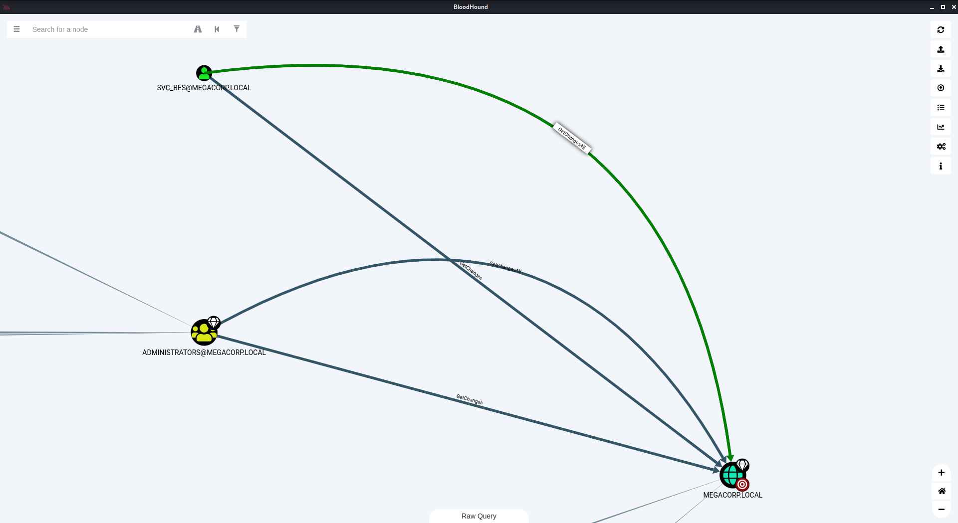 Podemos ver que o usuário svc_bes se liga diretamente ao DC e tem privilégios GetChangesAll. Isso significa que este usuário tem privilégios de solicitar informações sensíveis do DC, inclusive hashes de senhas.