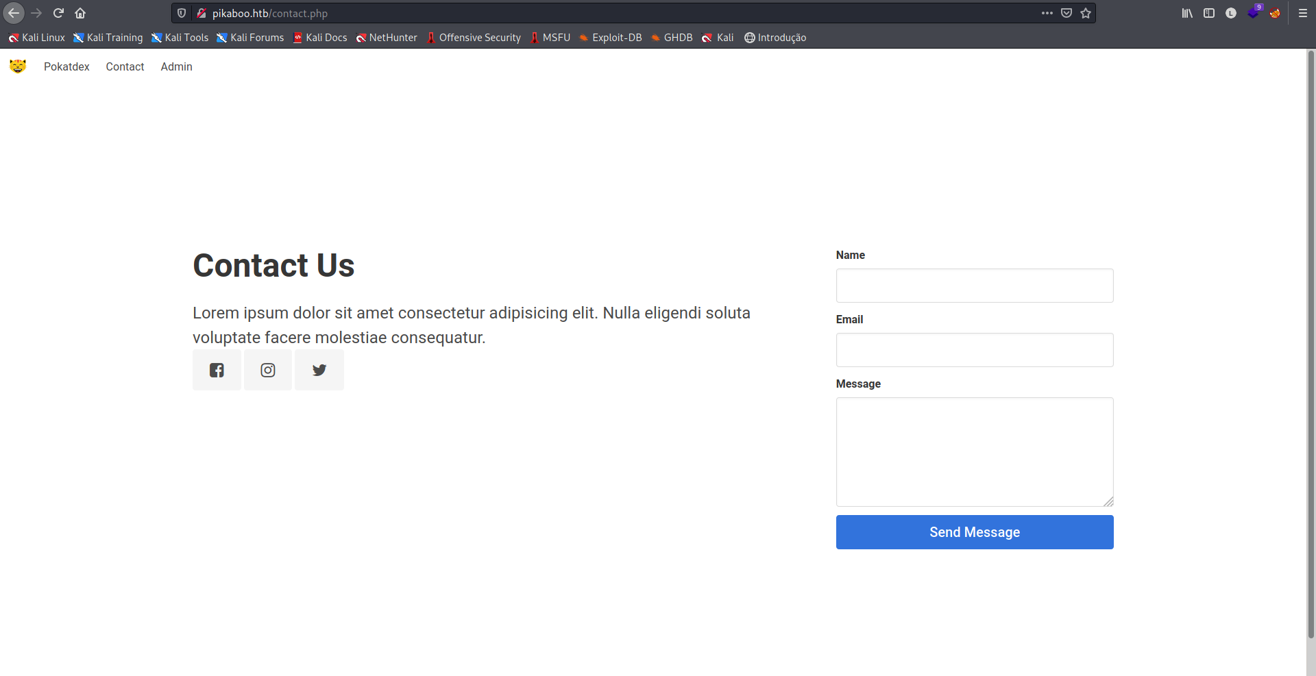 Em Contact, temos um simplfes formulário de contato sem nada aparentemente utilizável na exploração.