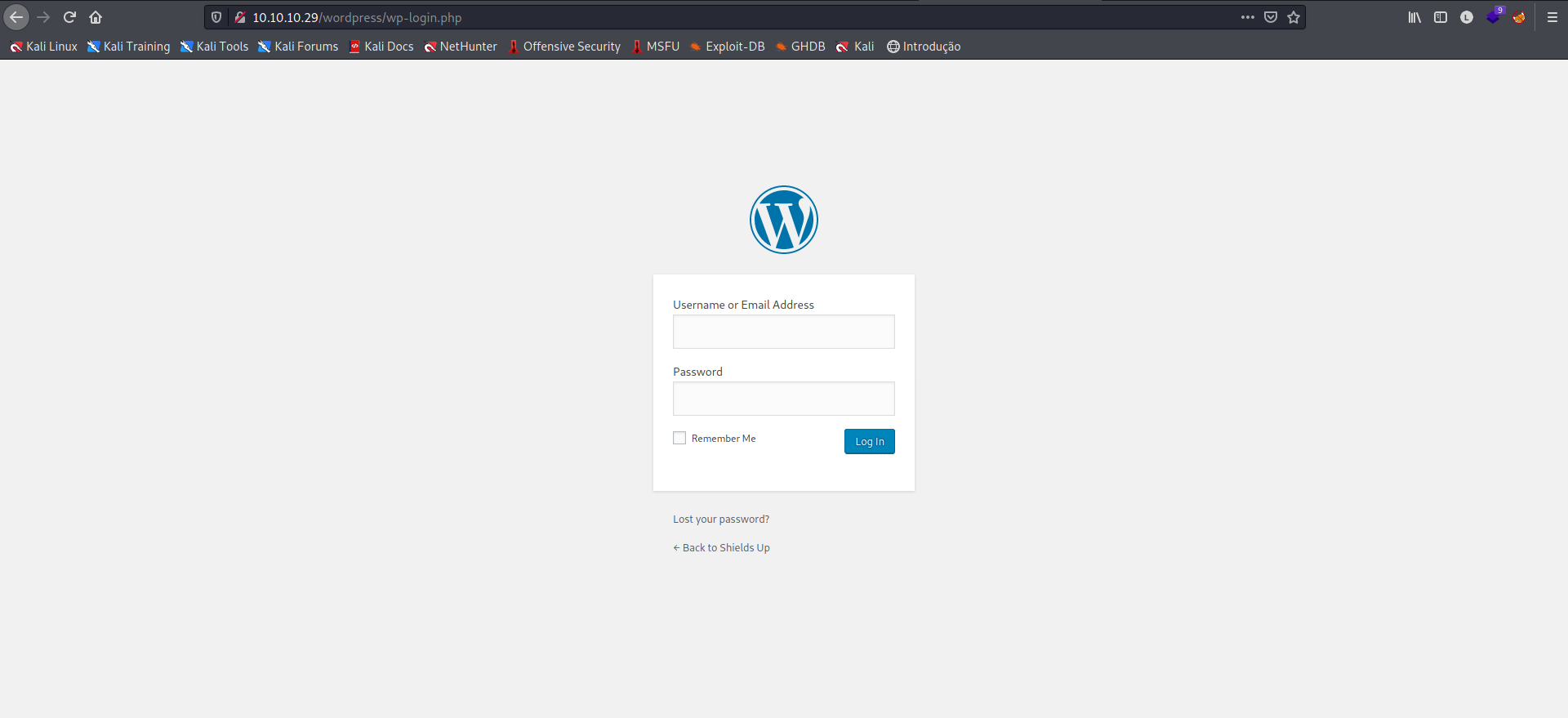 Por padrão, o usuário precisa se autenticar no CMS e configurar e editar todo o blog/site. Sua página de autentucação, por padrão fica em wp-login.php, vamos verificar se esta página está com as configurações padrão, acessando http://10.10.10.29/wordpress/wp-login.php.