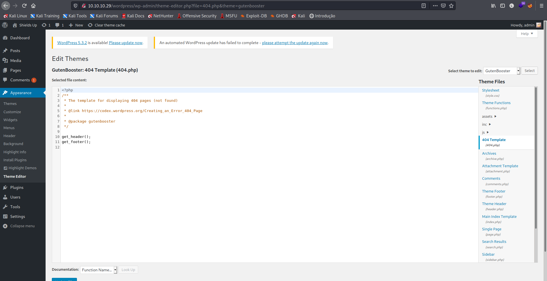 Se selecionarmos o tema GutenBooster, podemos editar o código fonte da página 404.php.