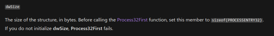 processEntry.dwSize = sizeof(PROCESSENTRY32);