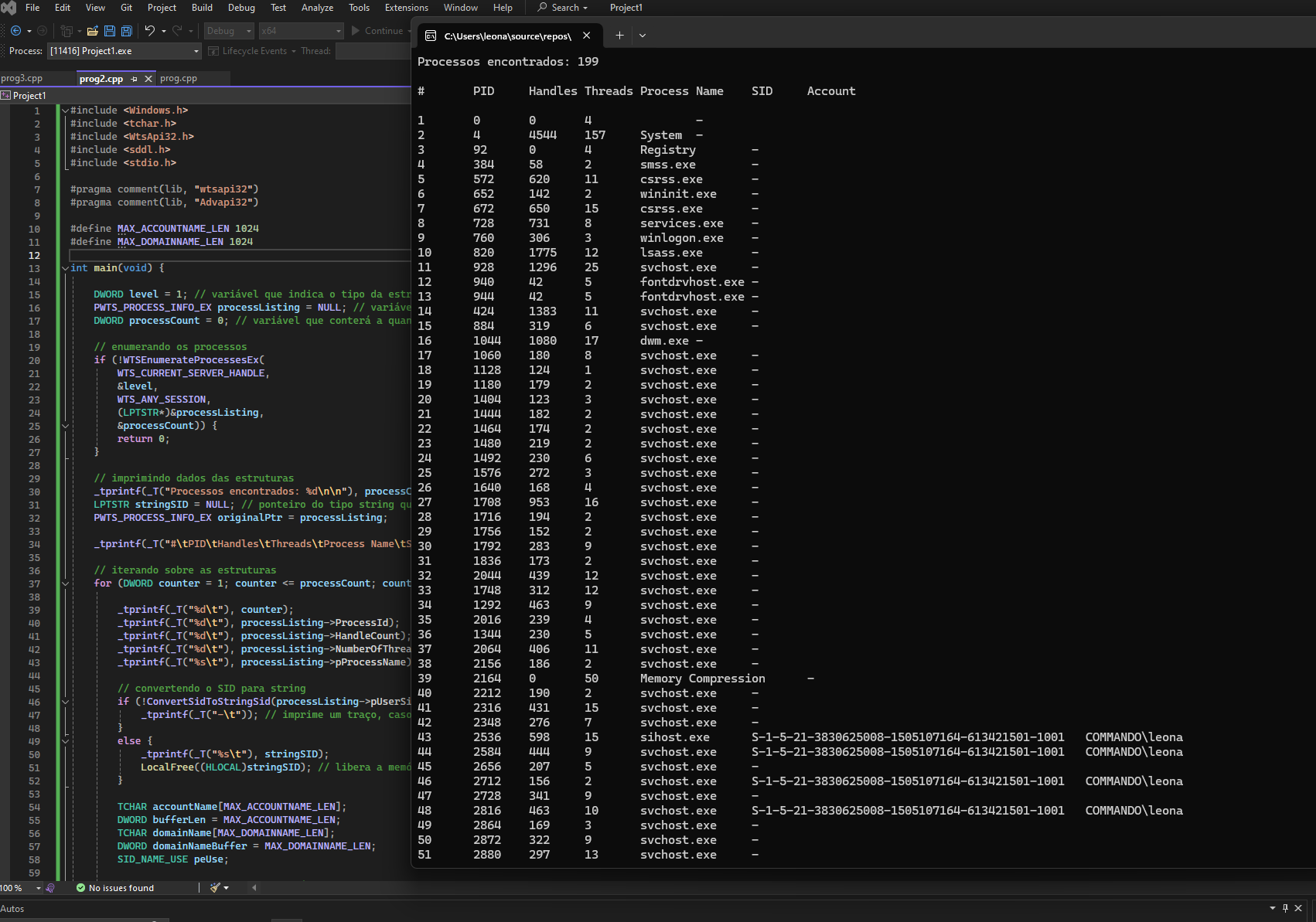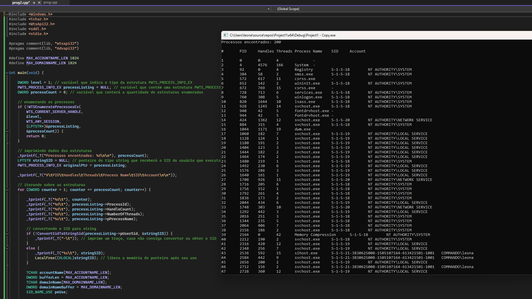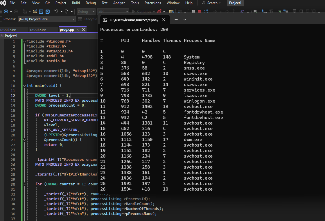 Somente com estas duas funções é possível obter uma enumeração básica dos processos em execução em uma máquina. Basta invocar a função WTSEnumerateProcessesEx e imprimir as informações do objeto PWTS_PROCESS_INFO_EX.