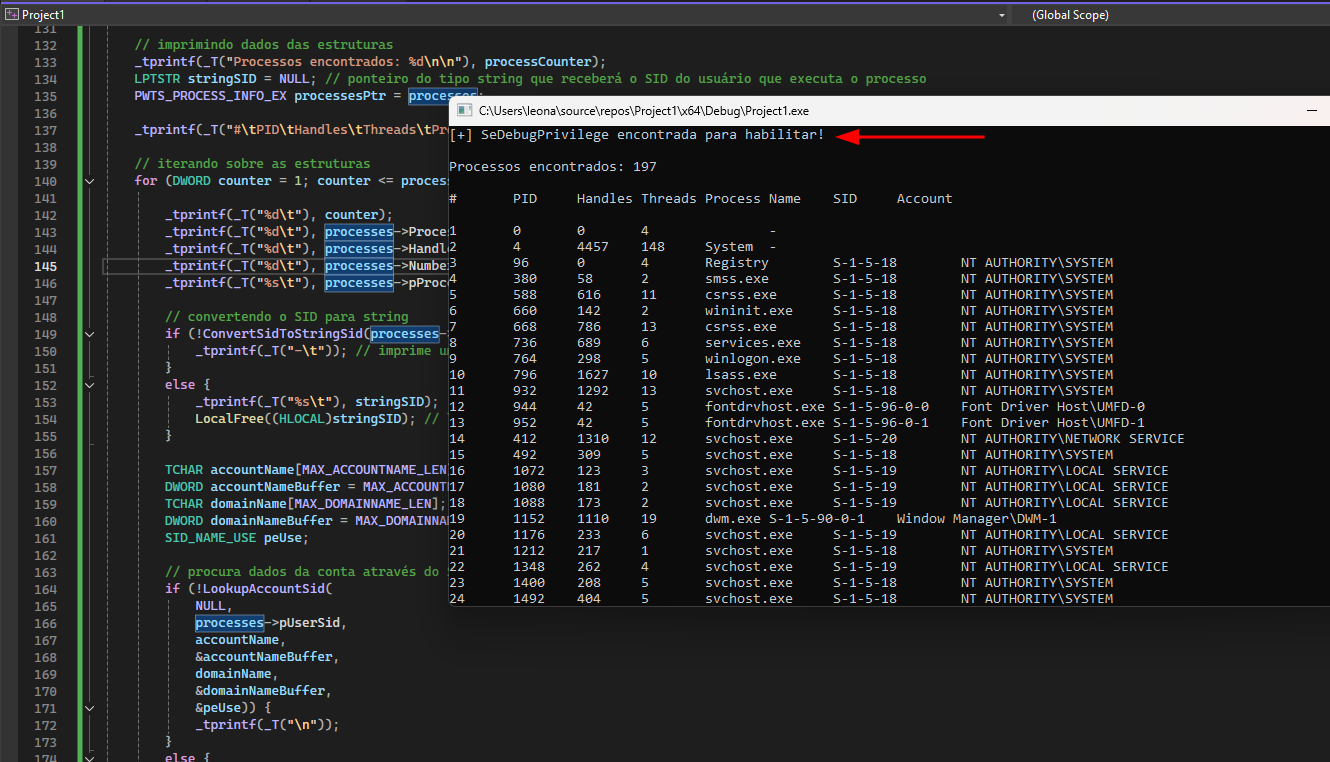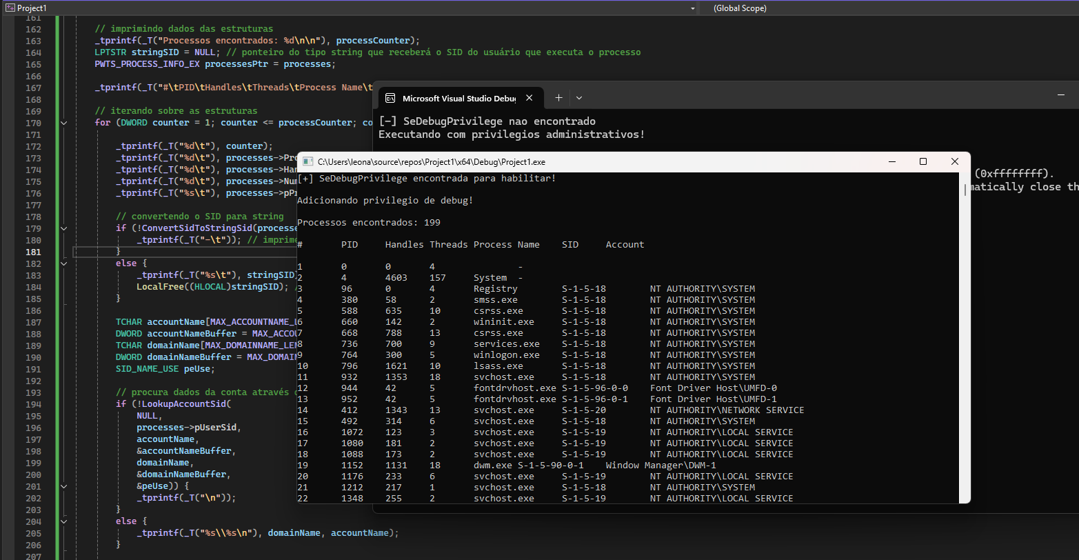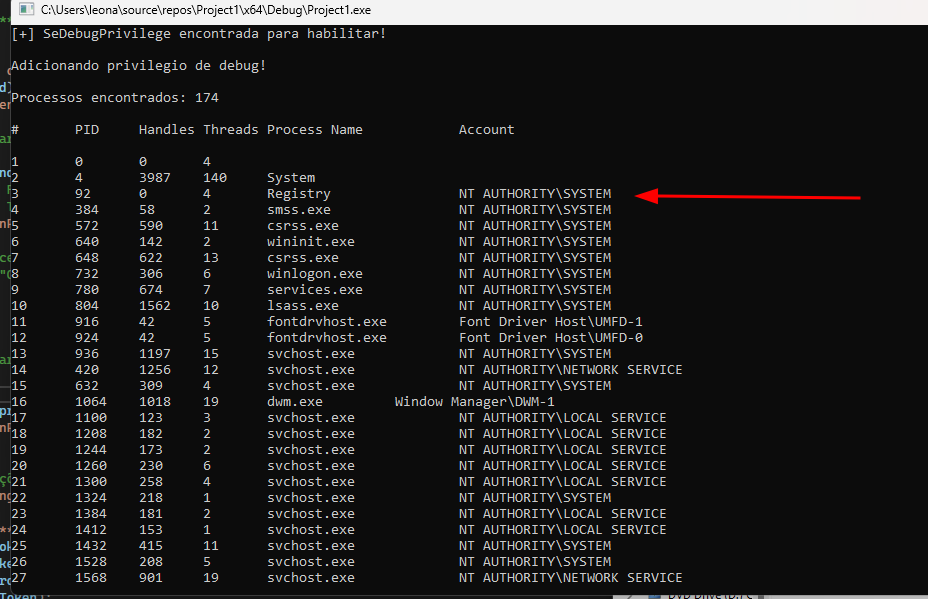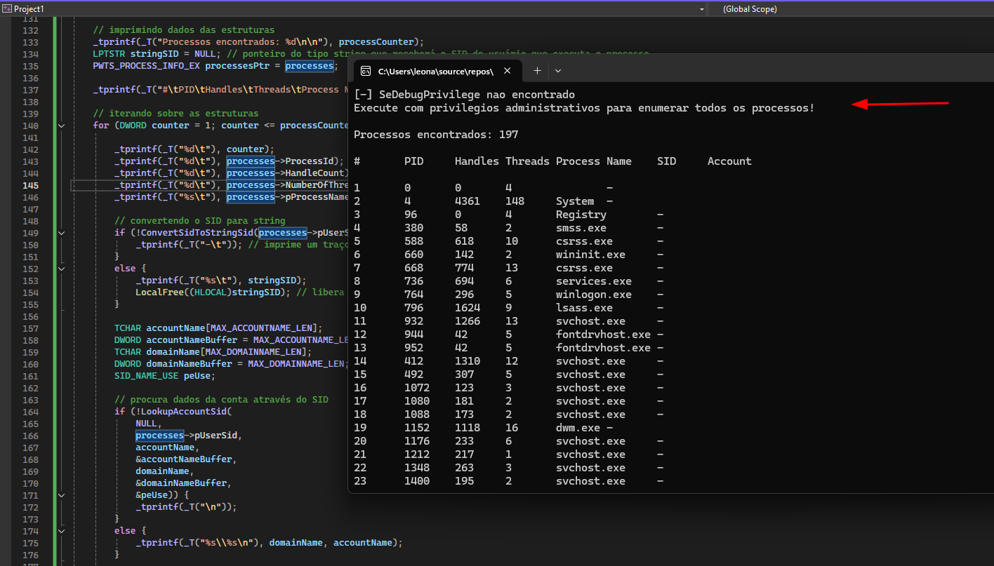 Porém, assim como a API WTSEnumerateProcessesEx, ela exige o privilégio SeDebugPrivilege para enumerar processos de privilégio elevado.
