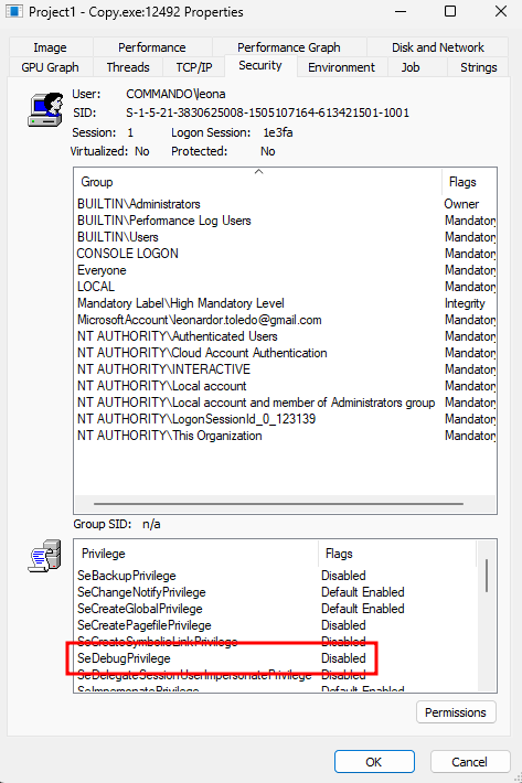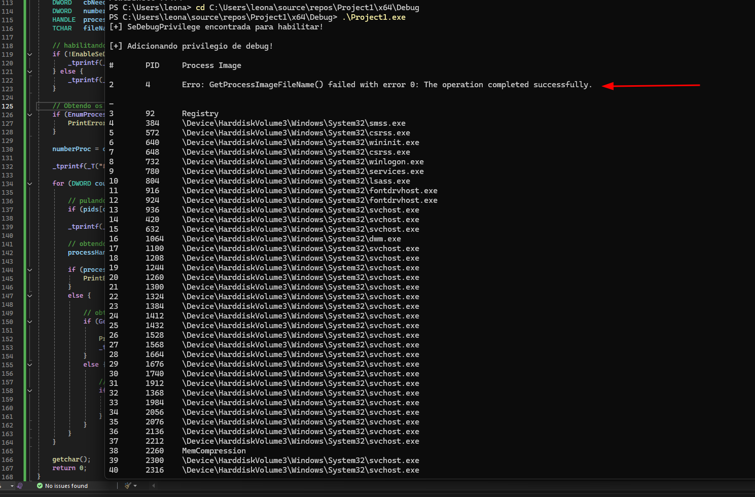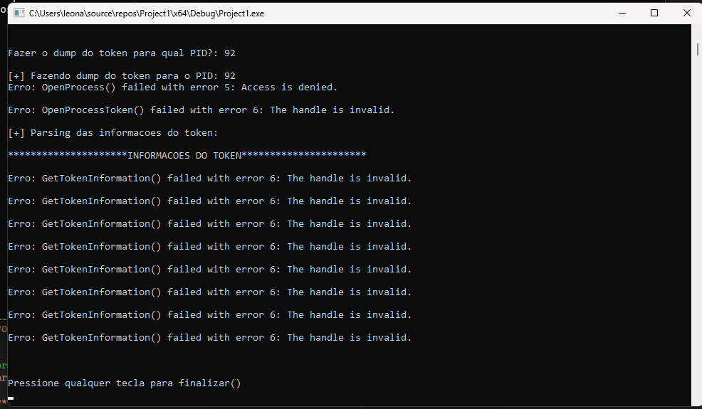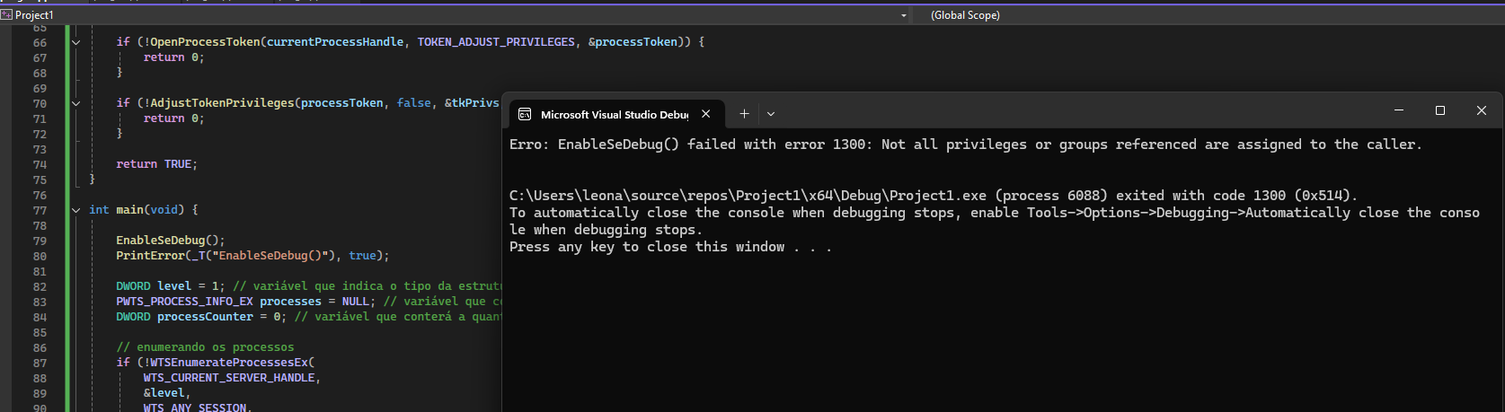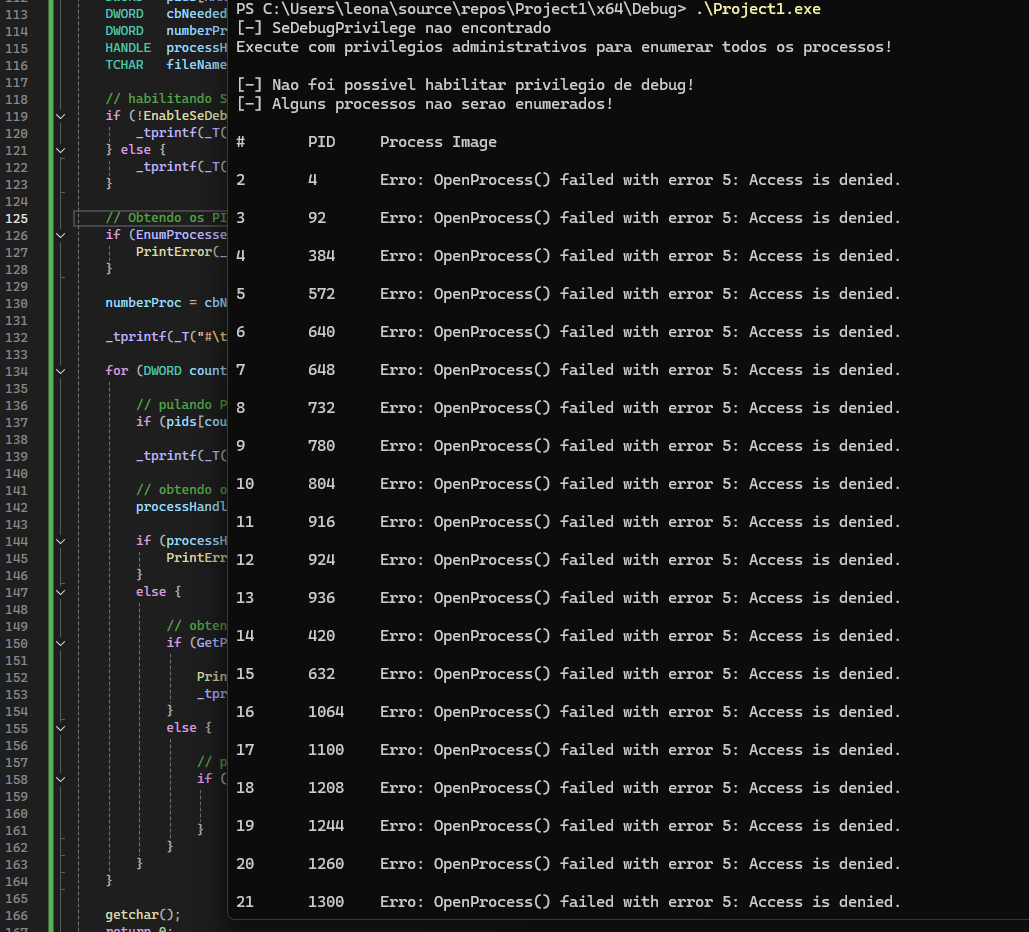 Quando executamos o programa como usuário comum, vemos que não foi possível habilitar o SeDebugPrivilege e houve erro na enumeração de processos elevados.