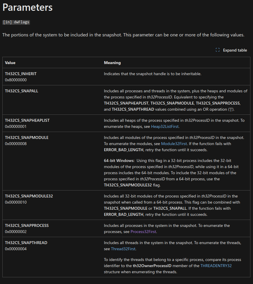 - https://learn.microsoft.com/en-us/windows/win32/api/tlhelp32/nf-tlhelp32-createtoolhelp32snapshot