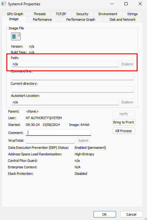 Quando expandimos as propriedades deste processo, vemos que ele não tem um path.