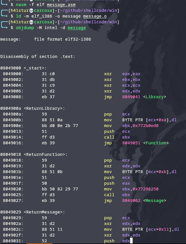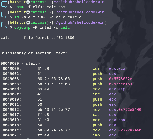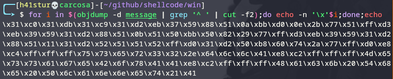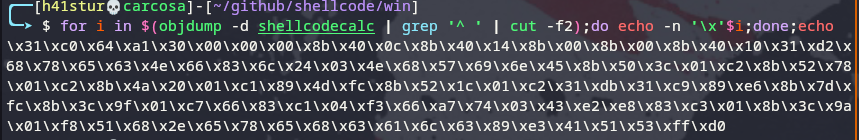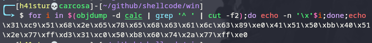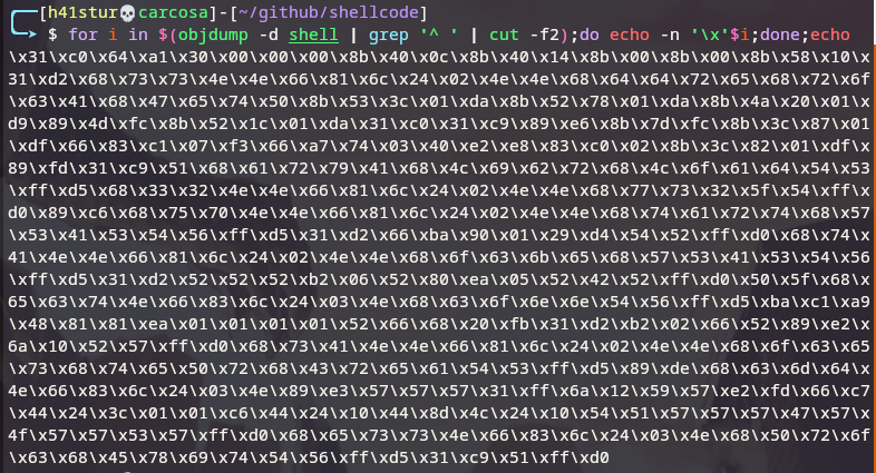 Para transformar o programa em shellcode, utilizaremos o mesmo oneliner de sempre: