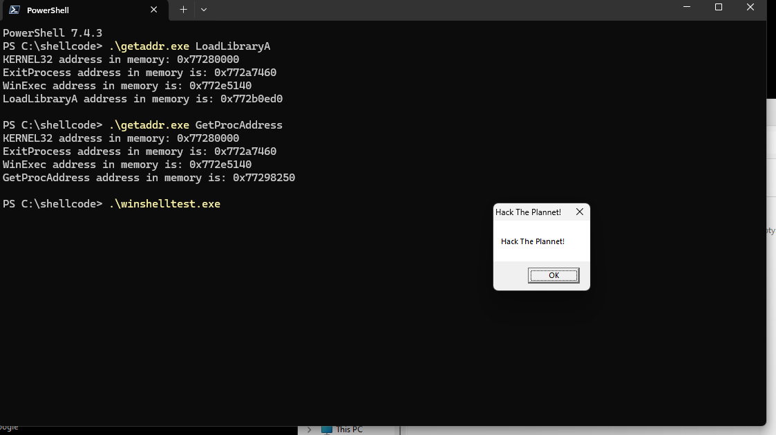 Estes são os passos primordiais para um bom shellcode no ambiente Windows com endereços dinâmicos. No exemplo desenvolvido, foi utilizada a função WinExec(), porém existe uma infinidade de funções úteis, como CreateProcess(), GetProcess(), entre outras. Os passos mais importantes são o de encontrar o endereço base da kernel32.dll, entender a estrutura interna desta DLL e entender como funcionam as estruturas TEB e PEB.
