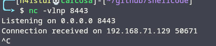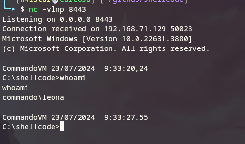 Uma vez que tudo esteja pronto, ao compilarmos o programa e executarmos na máquina Windows alvo, com um listener ouvindo no socket configurado, temos o reverse shell.