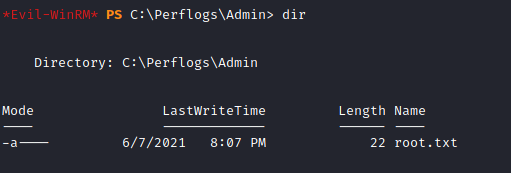 Em C:\Perflogs\Admin> encontramos a flag root.txt.