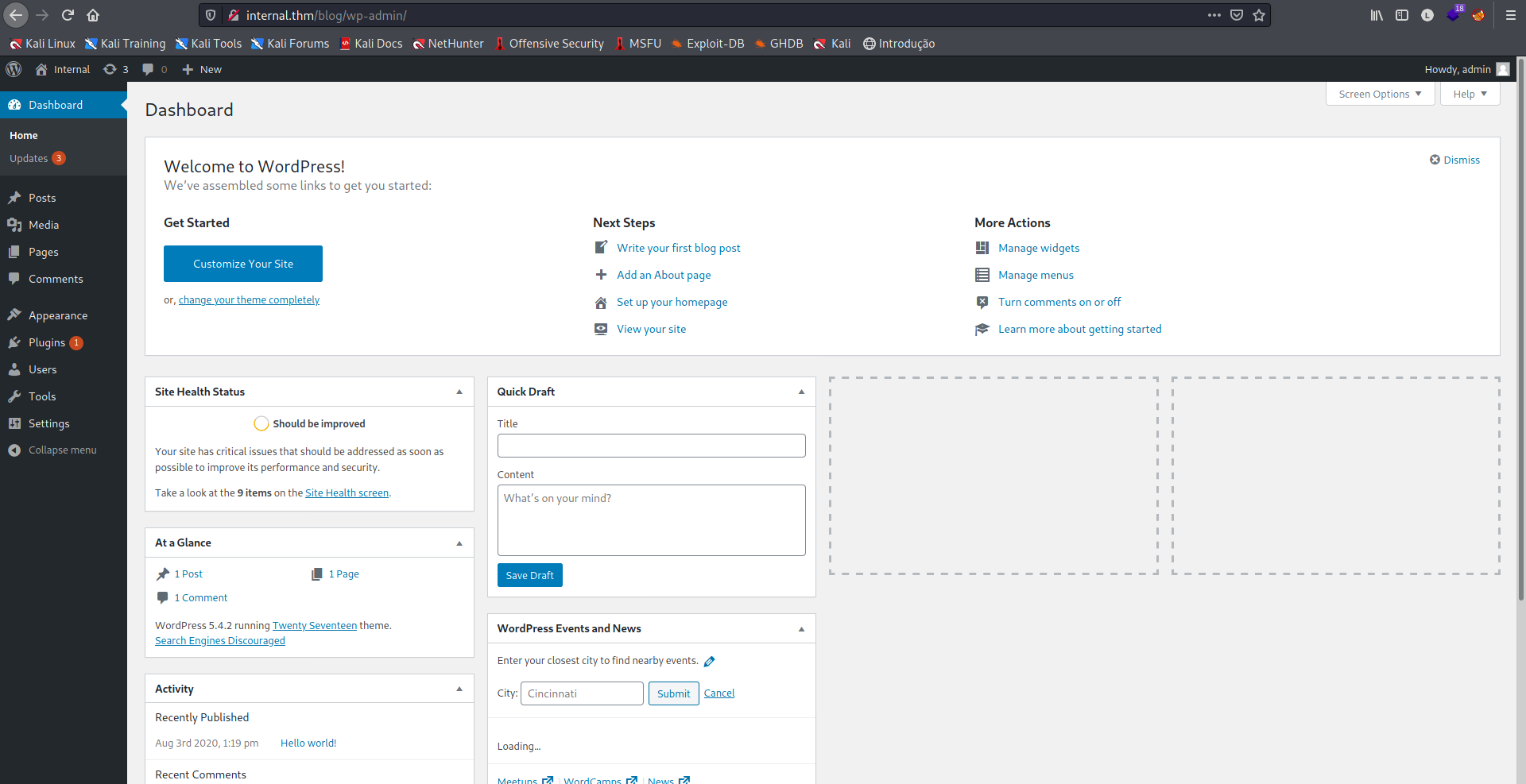 A verredura nos trouxe dois diretórios interessantes, o /blog e o phpmyadmin, vamos ver o que está em http://internal.thm/blog.