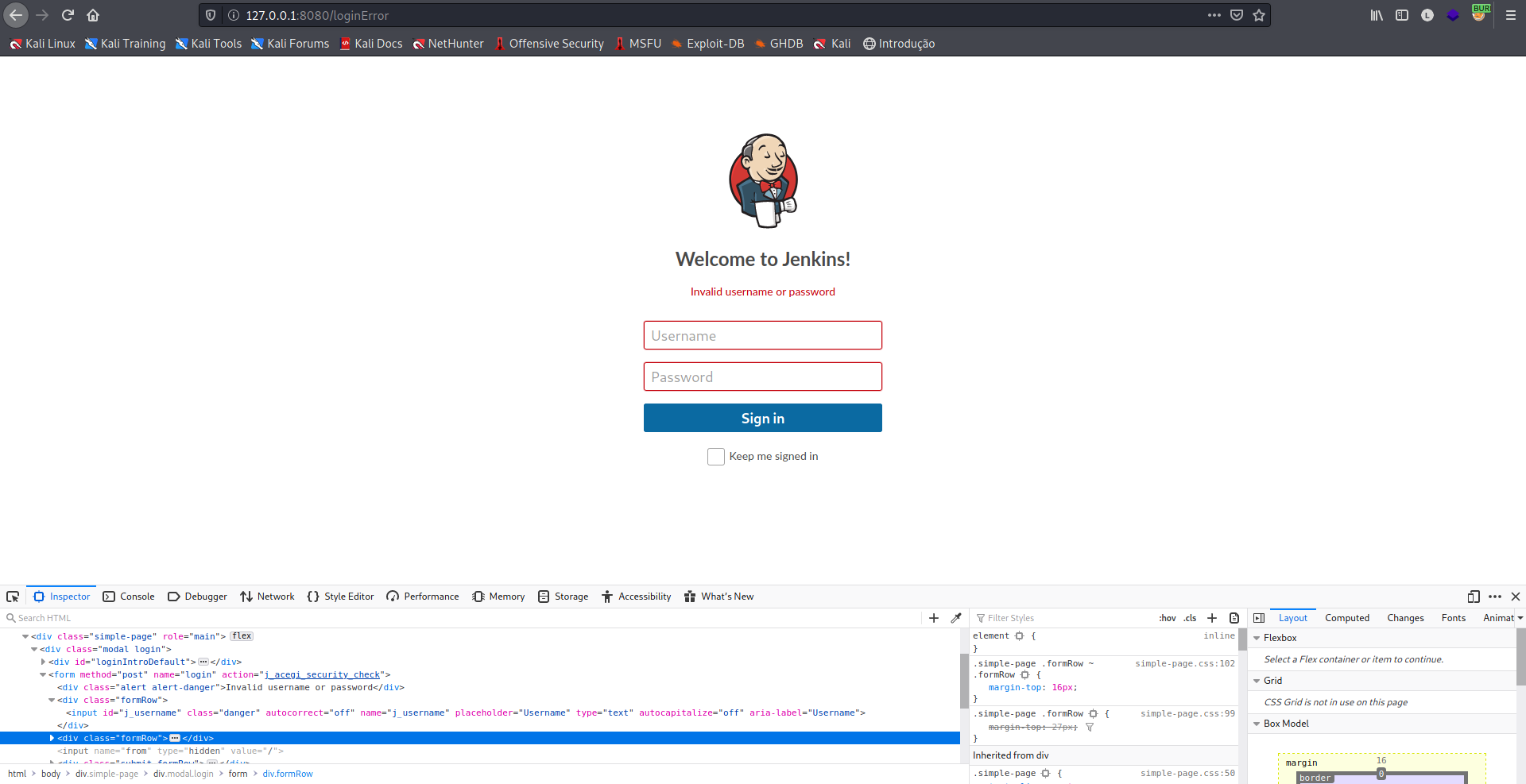 Primeiro precisamos verificar os parâmetros de login e senha e a mensagem de erro quando o login falha, podemos pressionar F12 no Firefox e verificar os nomes de campos e actions.
