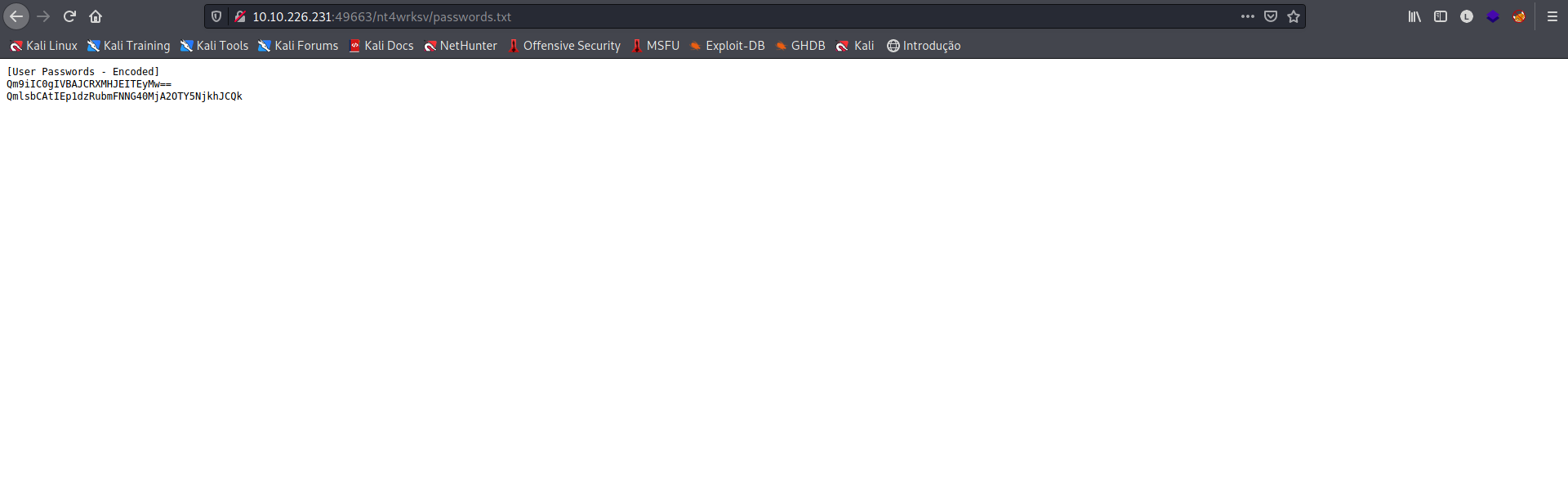 Temos duas credenciais, mas ainda não sabemos para qual serviço em questão, vamos tentar acessar o arquivo passwords.txt pelo browser, para confirmar se o diretório web é o mesmo do SMB.
